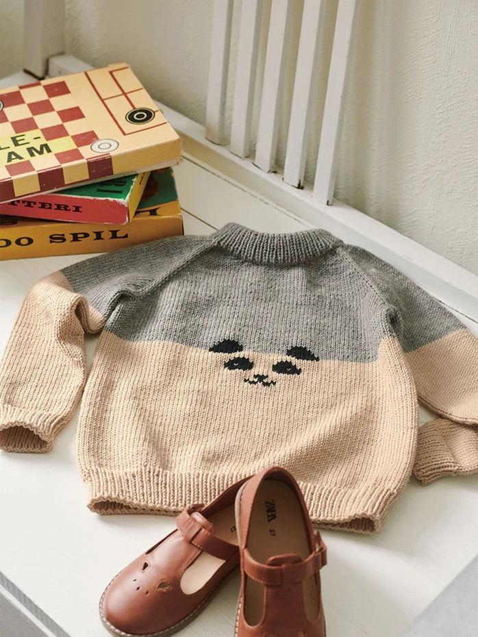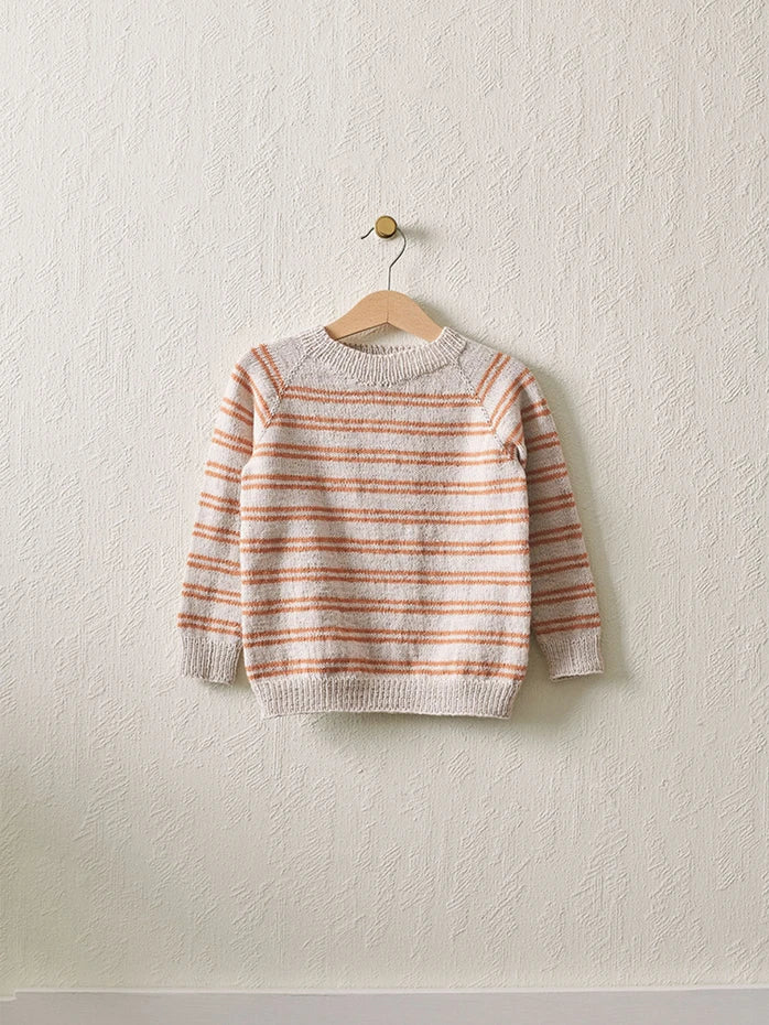 En av favorittene våre er Billys stripegenser. En litt oversize genser, strikket ovenfra og ned. Peters ribbgenser har du sett i ulike varianter i tidligere kolleksjoner. Denne gangen er ribbsekvensen litt annerledes, shapen er også mer oversize, og den er strikket ovenfra og ned. Vi har to varianter i denne kolleksjonen, en med enkel og en med dobbel tråd. Popcorn slipover ble veldig populær i høstens kolleksjon, nå får du den også som jakke. Både vest og jakke finnes også i damestørrelser, så mor og barn kan matche hvis de vil. Elsa genseren er rask, enkel og morsom å strikke og den finnes også til mor. Alfreds genser er enkel og rask å strikke. Pandagenseren og Bjørnegenseren kan lett bli favoritter hos barna, super søte og enklere enn du tror å strikke. Ansiktene broderes etterpå med maskesting og jammen kan du ikke lage en pandabukse også! Pauls perleribb bukse er god, myk, elastisk og utrolig fin i uttrykket. Buksen strikkes ovenfra og ned. Simpelthen stripegenser, strikkes ovenfra og ned.