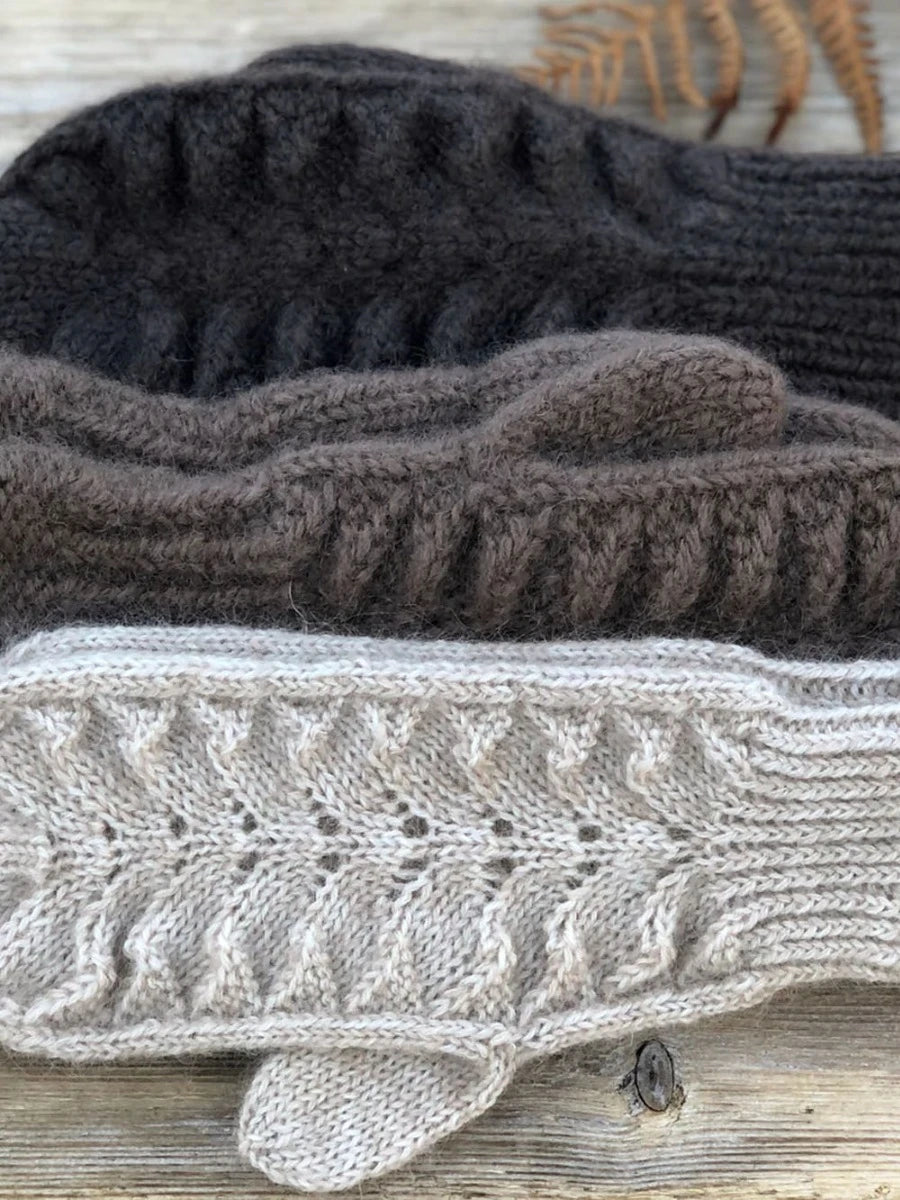 De kan strikkes rundt på strømpepinner eller på en lang rundpinne med Magic Loop. Om du strikker med strømpepinner anbefaler jeg å strikke oversiden på 1 pinne og undersiden på 2 pinner.